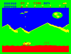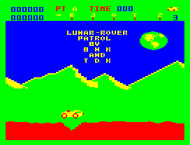 Given the hardware constraints of its platform, Lunar Rover Patrol does an admirable job of evoking the look and feel of classic coin-op cabinets. The background horizon scrolls in multiple layers, creating a simple yet effective parallax effect that gives the illusion of soaring across an endless lunar plain. Crater rims and rock outcroppings pop against the dark sky, their pixel art carefully shaded to convey depth and texture.