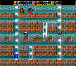 Battle Lode Runner takes the classic Lode Runner formula and injects a fireworks-style intensity thanks to its signature five-player mode. Each level is a tightly designed platform arena where the primary goal is to collect all the scattered gold pieces while evading relentless enemies. Armed with a drill, you can bore holes in the floor to temporarily trap foes—though this only stuns them for a few seconds before they pop back up, adding constant tension to every move.