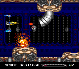 Visually, Sinistron stands out with impressively large enemy sprites that dominate the playfield, giving each stage a palpable sense of scale. The bosses, in particular, tower over your ship, their detailed designs revealing multiple weapon pods and vulnerable cores that you must target under fire. Backgrounds shift fluidly from neon-lit asteroid belts to fleshy, organic interiors, reinforcing the notion that you’re fighting a biomechanical menace rather than mere starships.