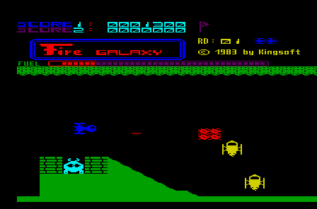 Visually, Fire Galaxy employs a character-based scroller that moves in 8-pixel increments, lending the game a slightly chunkier, arcade-authentic feel. The large, bold sprites stand out crisply against the darker cavern backgrounds, making it easy to track your ship, incoming projectiles, and enemy formations even when the action heats up. While the color palette is limited, contrasting shades are used effectively to differentiate hazards, fuel silos, and alien ships.