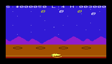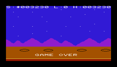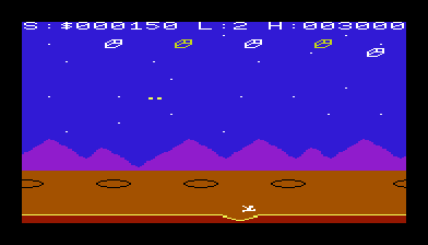 Quadrant delivers fast-paced, side-scrolling action that keeps you on your toes from the very first wave. You control Boris, the volunteer defender of the Northern Quadrant on the planet Synlac. As he dashes forward automatically, you must time your jumps to clear sudden craters, dodge incoming alien fire, and pick off flying invaders above. The simplicity of two-button controls—one for jumping and one for speed toggle—belies the depth of challenge waiting in each run.
