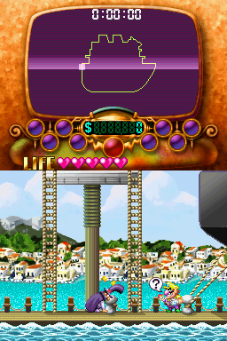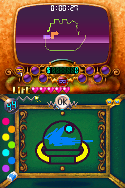 The stage backgrounds showcase the DS’s dual-screen capabilities well. While the action unfolds on the top screen, the bottom touch-screen displays intuitive drawing prompts and contextual hints. Environmental art, from neon-lit TV studios to ancient ruins, remains colorful and detailed despite the hardware’s limitations, providing a consistently appealing backdrop for Wario’s hijinks.