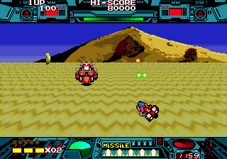 Burning Force’s graphics stand out for their vibrant color palette and smooth animation frames, pushing the hardware to create a convincing 3D tunnel effect. As you arc around the globe, mountains, deserts, and futuristic cityscapes scroll past in layered backgrounds that impart a real sense of motion. Enemy sprites are well-defined and varied, from squadrons of flying saucers to articulated mechs that lumber toward you with menacing intent.
