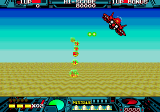 Burning Force delivers a fast-paced, pseudo-3D scrolling shooter experience that puts you directly behind the blue-haired heroine, Hiromi, as she soars across varied environments on her red airbike. The behind-the-character perspective offers a dynamic sense of speed and depth, challenging players to weave between obstacles and enemy fire in real time. Each stage loops you around the planet’s surface, demanding quick reflexes and sharp situational awareness to dodge incoming attacks and environmental hazards.