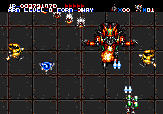Visually, M.U.S.H.A. is a standout on the Sega Genesis/Mega Drive. Its richly detailed sprites bring the fusion of feudal Japanese aesthetics and sci-fi mecha design to life. Your ninja mecha is intricately animated, its glowing energy blades and rocket boosters rendered with striking clarity even amid chaotic on-screen explosions.