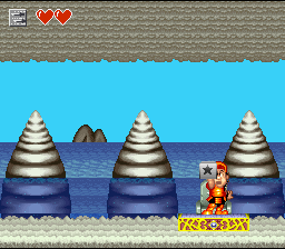 Leveraging the SNES hardware to great effect, Super Adventure Island II delivers vibrant, colorful pixel art that brings its tropical settings to life. Palm-fringed beaches, dense jungle canopies, and misty mountain peaks are rendered with a charming level of detail, while subtle parallax scrolling adds depth to each scene. Animations are smooth, whether it’s Higgins’ exuberant high-jump or the way water ripples around his raft as you glide between islands.