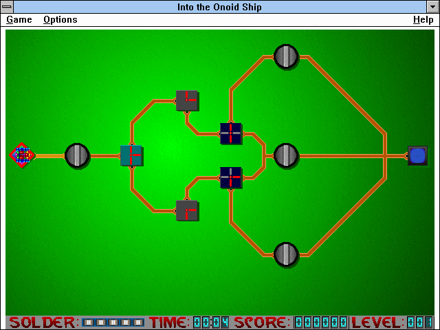 Built for Windows 3.1 before Microsoft introduced WinG, Nanotank’s visuals are a snapshot of early ’90s PC gaming. The art style relies on simple, tile-based graphics with bold, high-contrast colors that help you quickly distinguish walls, switch panels, and energy conduits. While the resolution is low by modern standards, the crisp icons and clearly defined board layouts make it easy to parse each puzzle at a glance.