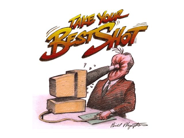 As a novelty package, Take Your Best Shot stands out for its audacious sense of humor and Plympton’s distinctive art. The three arcade mini-games act as simple vehicles for the main attraction—the Joe vs. Boss extravaganza—and while they’re serviceable, they’re not what will keep you coming back. Instead, it’s the bizarre weaponry, snappy insults, and grotesque animations that define the package.