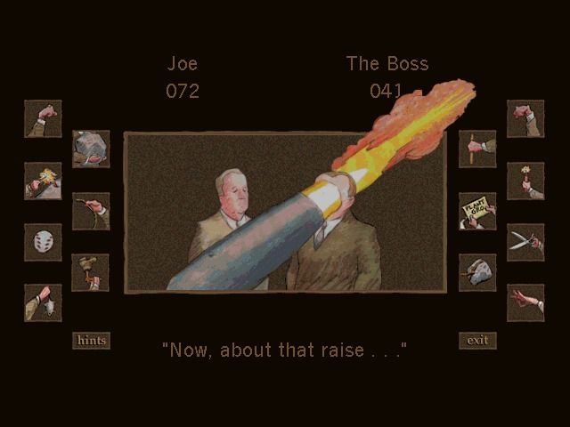 The true centerpiece is the “Joe vs. Boss” interactive showdown, where players select outrageous weapons to humiliate one another. Here, timing and button-mashing determine whether Joe fires a cannon at his superior or ends up on the wrong end of a lawnmower blade. While the premise is delightfully bizarre, the combat mechanics boil down to clicking through attack animations, offering more novelty than sustained challenge.