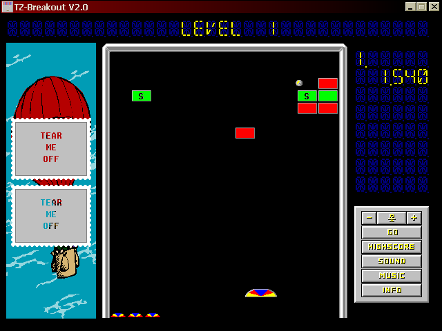 The inclusion of a cartoon character on the left side of the screen adds an extra scoring layer. Three stamps cover the cartoon, and by hitting green S-bricks you peel them away for bonus points. This mechanic encourages you to balance aggressive brick destruction with precision targeting, rewarding skilled players who can multitask between clearing the board and unmasking the artwork swiftly.