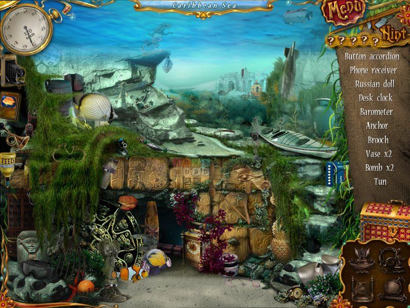 Beyond basic object hunting, the game introduces playful interactive tools. You can photograph passing fish to earn additional clues and fill an in-game species album. Fish marked with a question mark yield extra hints, rewarding keen-eyed explorers. If the underwater world becomes overwhelming, blast the horn to scare away flotsam or lure creatures into view with the food dispenser.
