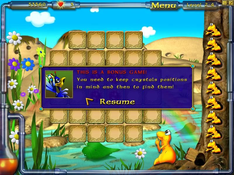 The game’s flow is well-paced: clear all the gold tiles on a board to move forward, and enjoy a mid-stage bonus level every other stage. In these bonus rounds, a handful of crystals flip face-down, and you must click their original positions from memory. Nailing these tests of observation and recall rewards you with extra lives or power-up tokens, keeping the energy high and breaking up the regular match-three rhythm.