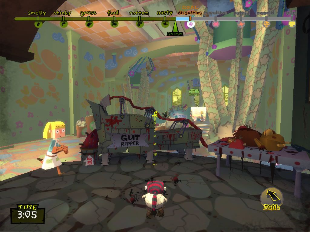 American McGee’s Grimm: Puss in Boots maintains the series’ signature blend of platforming, light puzzle-solving, and the creative “Grimm Power” mechanic that allows players to unleash chaos on a fairy-tale world. As with previous entries, you guide Grimm through each level by splattering scenes in blood-red darkness, corrupting storybook environments. The core controls feel familiar—jumping, running, and activating Grimm’s power—but the introduction of the speed power-up adds a fresh layer of strategy. When the level is swarming with Cleaners, you’ll need to sprint through sections at breakneck pace to avoid being scrubbed clean.