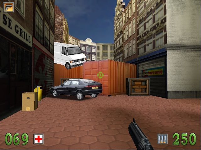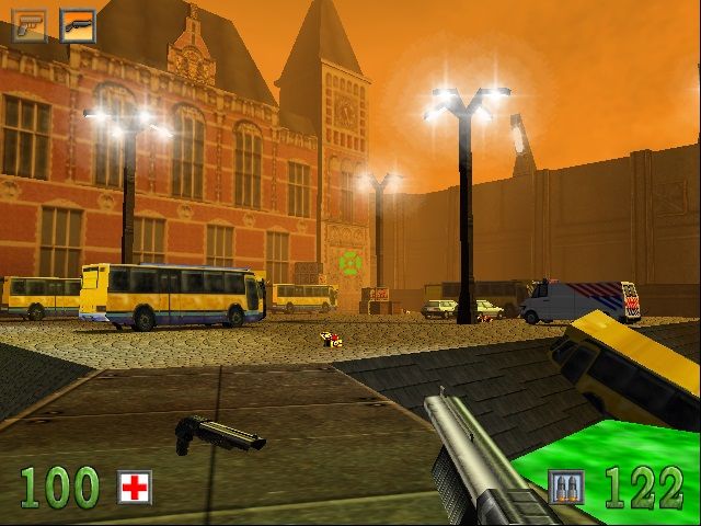 The level design in AmsterDoom revolves around faithful recreations of Amsterdam’s most iconic landmarks: you’ll fight on the Dam, sneak through the canal-lined streets of the Red Light District, and even battle extraterrestrial invaders inside the city’s wax museum. Each stage introduces unique environmental hazards—moving canal barges, fog-filled alleys, sliding museum display cases—that keep the pacing brisk and prevent the gameplay from growing repetitive. Though there are no hidden puzzles or elaborate side quests, the varying geography encourages players to rethink their approach to combat in each area.