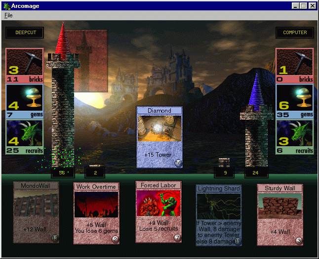 Arcomage delivers a surprisingly deep card-based strategy experience wrapped in a deceptively simple premise. Each player starts with a tower, a wall, and three key resources—bricks, gems, and recruits. On your turn, you draw cards that let you generate resources, erect defenses, or launch devastating attacks. The goal is to either construct your tower to a set height, amass enough resources, or demolish your opponent’s tower. This triple-win condition keeps each match dynamic, as you must adapt your strategy on the fly depending on which path your rival pursues.
