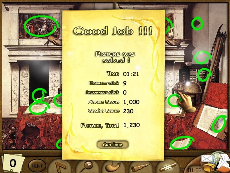 The user interface is clean and intuitive. Puzzles are framed in simple gallery-style borders, and the clickable areas highlight subtly to guide new players without handholding veterans. Animation is minimal but effective: when you correctly identify a difference, a small yellow circle pops up, giving you immediate feedback. Misclicks are punished gently with a brief shake of the painting rather than an abrupt penalty, keeping frustration low.