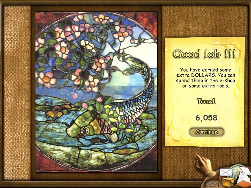 Beyond the main puzzles, Art Detective offers a variety of job types to break up the routine. In the reconstruction tasks, you take on an electronic jigsaw puzzle by clicking and swapping individual pieces until the painting is restored. Each correct placement locks that piece in place, giving you a satisfying sense of progress. Meanwhile, the cleaning challenges ask you to identify the proper chemical solution from an array of jars—choose wrong, and you’ll have to start the extractions over again or phone an expert if you’ve saved up enough cash.