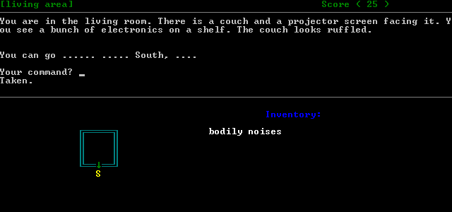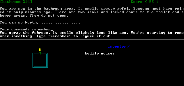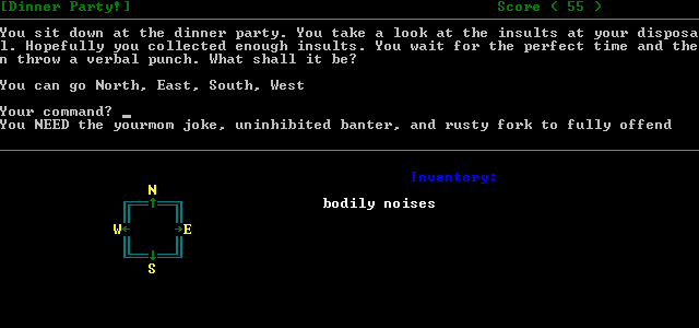 One standout feature is the built-in automap, rendered as an ASCII compass rose at the bottom of the screen. This simple visual cue ensures you never lose your bearings, showing available exits from each room without breaking immersion. For a game that openly espouses low aspirations, the compass rose is a surprisingly polished touch, adding clarity to navigation without resorting to flashy overlays or graphical trickery.