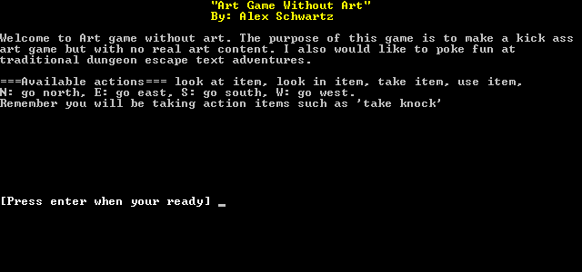Art Game Without Art is unabashedly small in scope, yet it makes every minimalistic element count. The pared-down parser, the ASCII compass rose, and the cheeky inventory items all coalesce into an experience that feels cohesive and intentional. It’s a game that knows exactly what it wants to be: a short, amusing diversion rather than a sprawling epic.