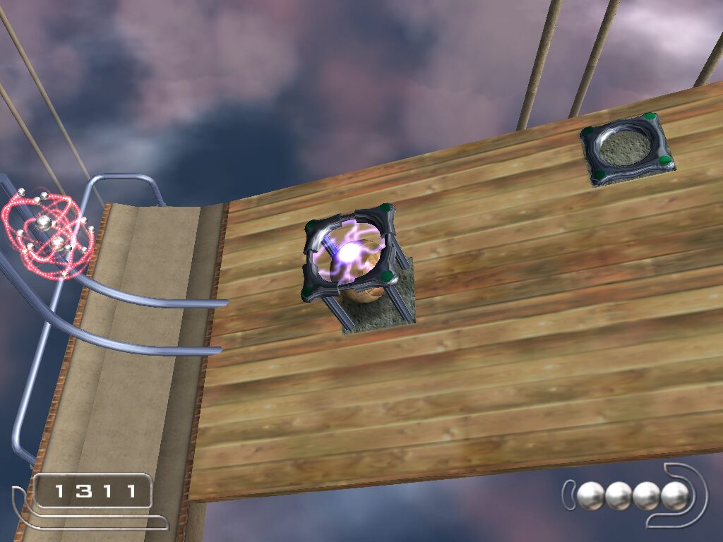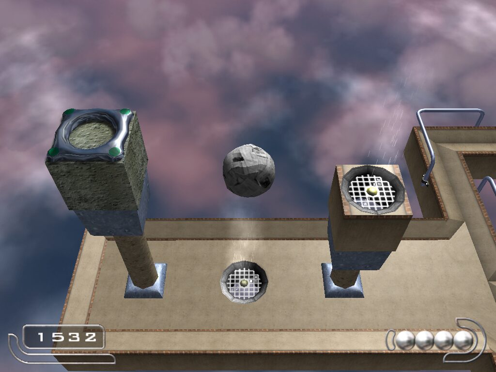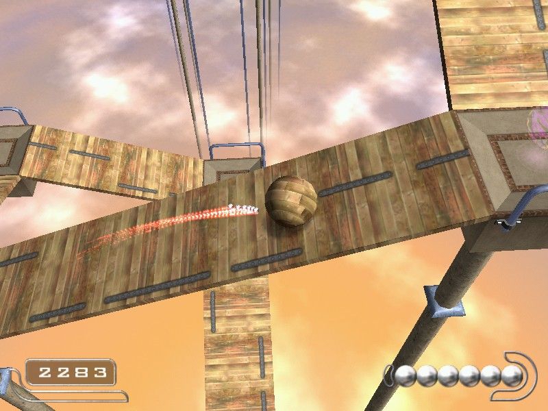 For its era, Ballance’s visuals hold up remarkably well. The game presents a richly textured world of floating platforms suspended in an endless sky, complete with varied themes—from mossy wooden bridges to sleek metallic corridors. Dynamic lighting casts realistic highlights on the ball’s surface, giving each material a convincing sheen: rugged patina for wood, solid luster for stone, and a delicate translucence for paper.