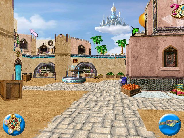Controls can take a moment to master: the bottle peripheral’s button is used for magic invocations, while the mouse and arrow keys handle movement and camera. Once acclimated, however, the system feels remarkably natural. The flying carpet sequences are particularly fun—hovering above the city sprawl, banking around minarets, chasing ribbons of magical light. These moments of aerial freedom contrast nicely with the tighter confines of city streets and palace halls, keeping gameplay fresh from start to finish.