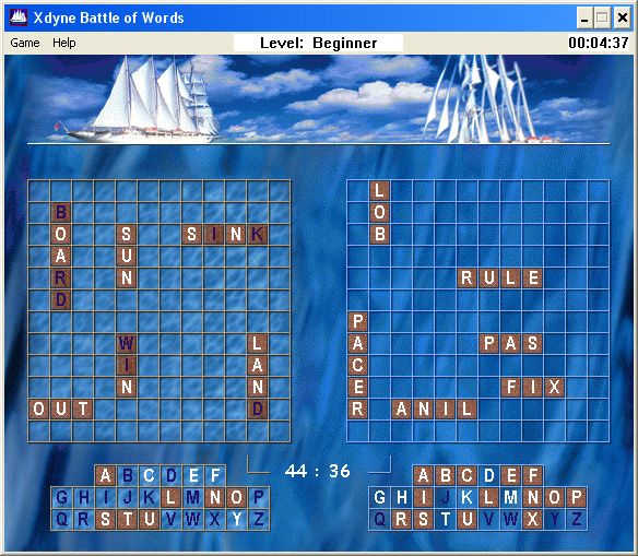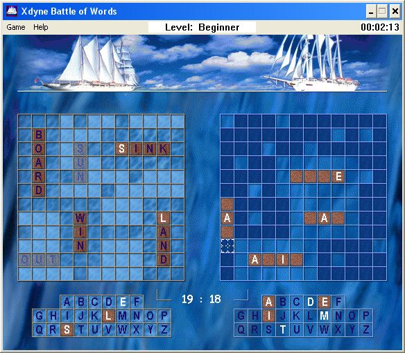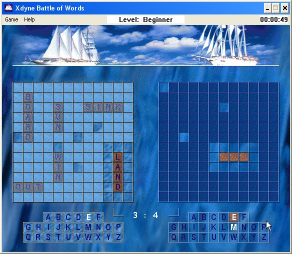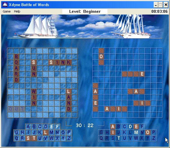 When the match starts, the playfield divides into four quadrants: your fleet (upper left), the enemy fleet (upper right), your alphabet (lower left), and the enemy’s alphabet (lower right). On your turn, you can fire at the water grid to uncover enemy ships or target the alphabet grid to reveal whether a letter is part of your opponent’s words. Hits—whether they strike a ship segment or uncover a valid letter—grant you an extra shot, while misses pass the initiative to the computer opponent, creating a continuous ebb and flow of tactical decisions.