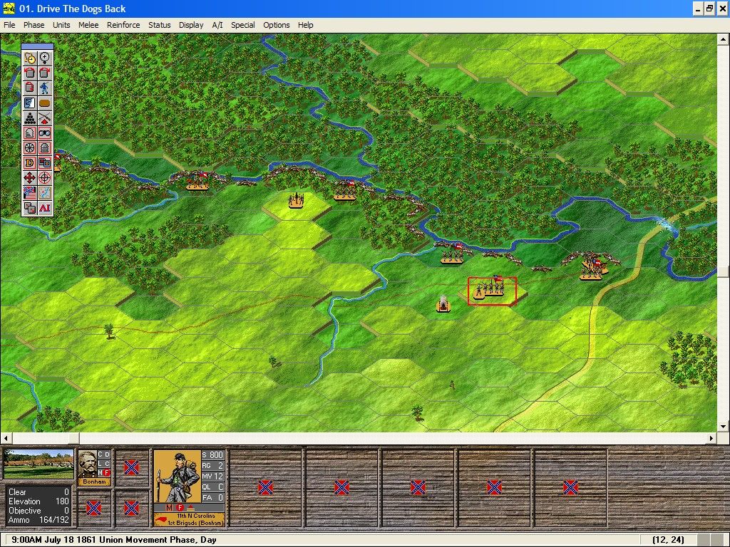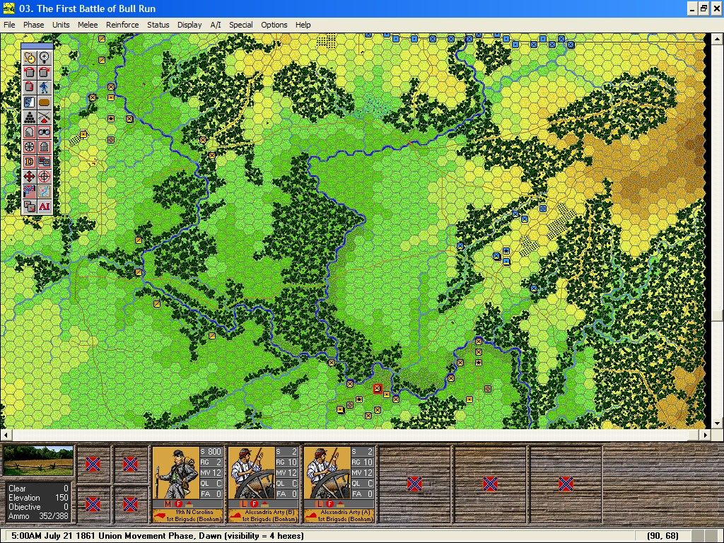 Battleground 7: Bull Run builds on the solid tactical framework of its predecessors while introducing new depth through its dual major engagements. Players can command either Union or Confederate forces across two full-scale battles—First Manassas and Second Manassas—alongside smaller but pivotal skirmishes at Blackburn’s Ford and Brawner’s Farm. Each map is rendered on a hex grid, offering familiar turn-based strategy that emphasizes unit positioning, timing, and terrain exploitation. The inclusion of side battles enriches the overall campaign flow, giving commanders a chance to test different force compositions before the main engagement.