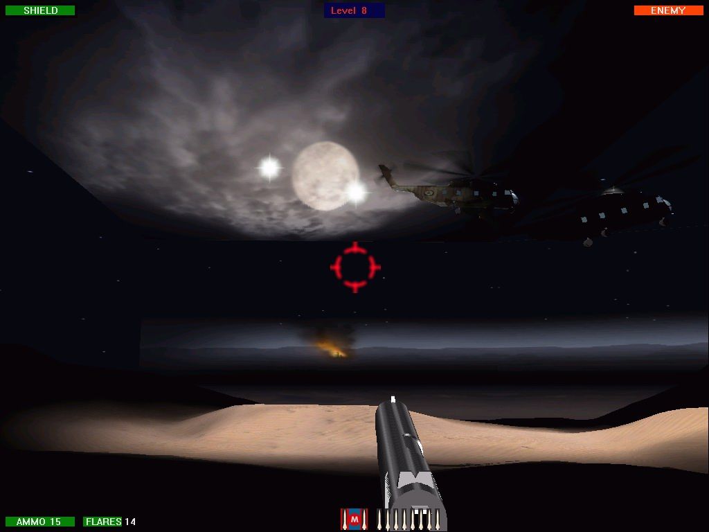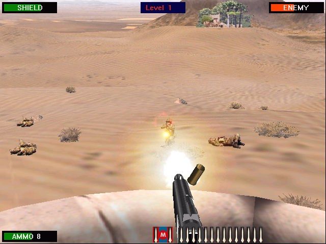 Beach Head: Desert War puts you behind a fixed turret emplacement in the midst of a sprawling Iraqi desert. From this stationary position, you can swivel a full 360 degrees to engage enemies approaching from any direction. The core loop is simple and satisfying: target incoming vehicles or aircraft, manage your ammunition and cooldowns, and react quickly as threats emerge from sandstorms or over distant dunes.