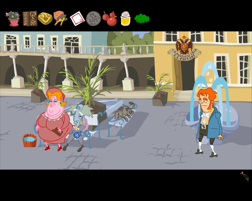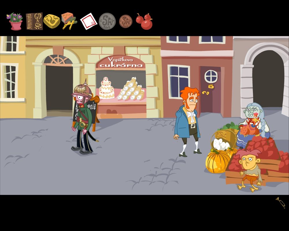 As an Adobe Flash creation, Becher’s Dream sports hand-drawn 2D visuals that capture the rustic charm of a Czechoslovak village in the 19th century. The color palette leans toward muted earth tones, evoking a sense of historical authenticity and underscoring the looming threat of war. Background environments are richly detailed—from wooden tavern interiors to misty forests—each frame almost feels like a painting.