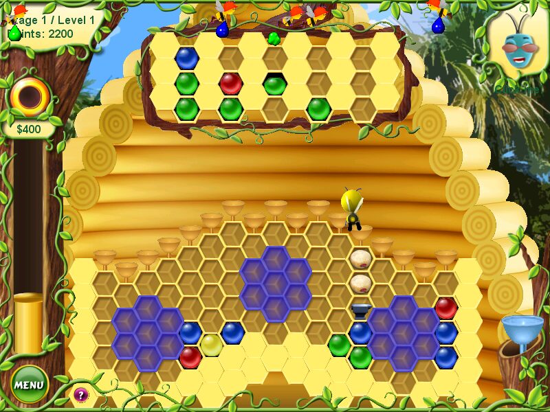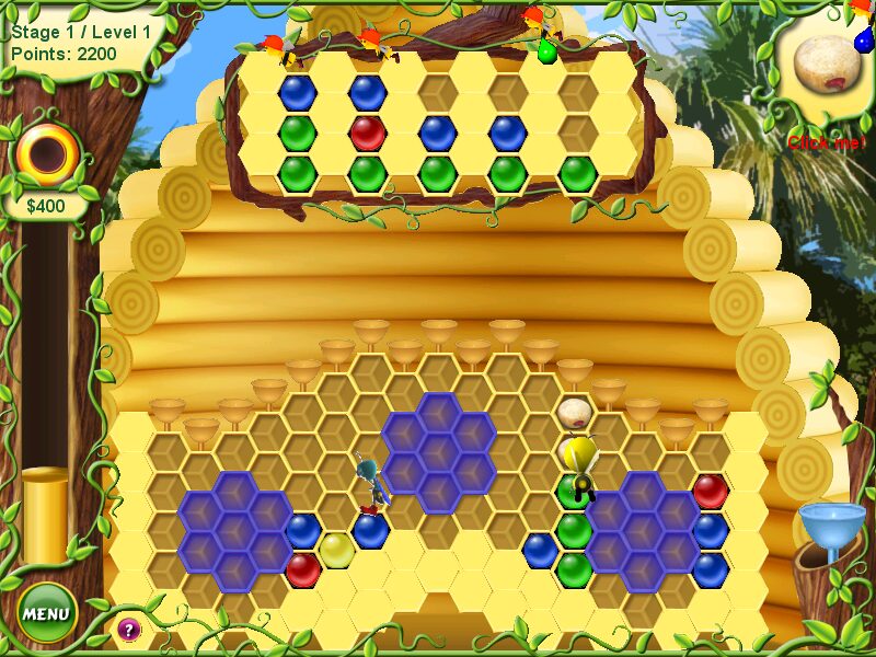 Visually, Beebo Deluxe embraces a bright, cartoonish aesthetic that instantly communicates each tile’s hue and shape. The honeycomb grid is rendered with warm amber tones, while the cells themselves boast bold reds, blues, greens, and yellows, making matches easy to spot even in the heat of fast-paced levels. Animations—such as the worker bees ferrying new columns or the cricket power-ups springing into action—are snappy and playful, reinforcing the game’s honey-harvesting theme.