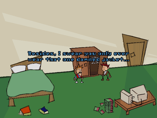 Visually, Ben There, Dan That! embraces a retro pixel-art style that pays homage to the golden age of SCUMM-engine classics. The 320×200 resolution and vibrant color palette evoke fond memories of early LucasArts and Sierra titles, yet the backgrounds are detailed enough to convey the bizarre, shifting architecture of the alien ship. Each room feels distinct, from the cluttered suburban living room to the sterile, ominous corridors of the extraterrestrial environment.