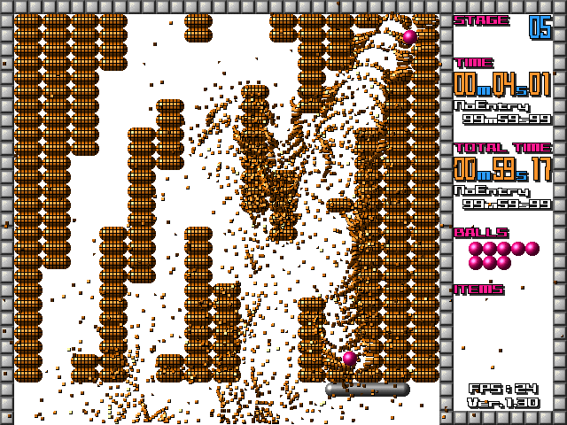 Adding depth to the gameplay are the numerous brick types and power-ups scattered throughout the stages. From blue bricks requiring two hits, to magnetic bricks that repel balls, and basket bricks that can only be hit from above, each element forces you to adapt your tactics on the fly. Red bricks drop power-ups—everything from tiny balls that make breaking bricks harder, to infinite-ball pickups—turning each stage into a mini-puzzle where planning and reflexes go hand in hand.