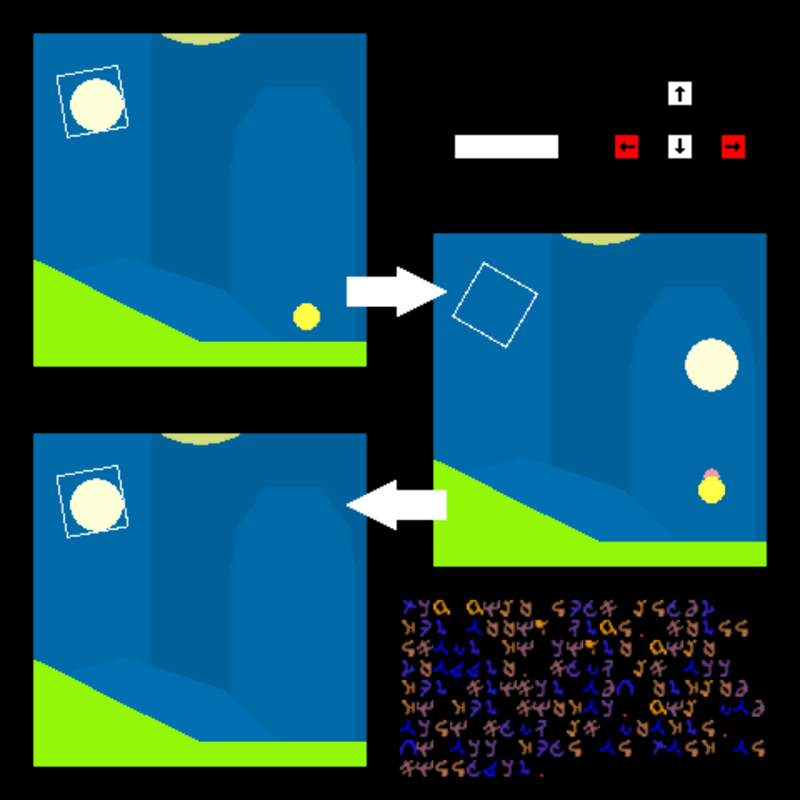 The title screen’s illegible custom font makes an immediate statement about the game’s experimental nature. At first glance, menu commands appear indecipherable, forcing players to tinker with the asset files—each letter of the alphabet is stored separately—to figure out how to start the game. This unconventional puzzle extends beyond the levels themselves and into the user interface, creating a sense of discovery that frames the entire experience as a form of interactive art.