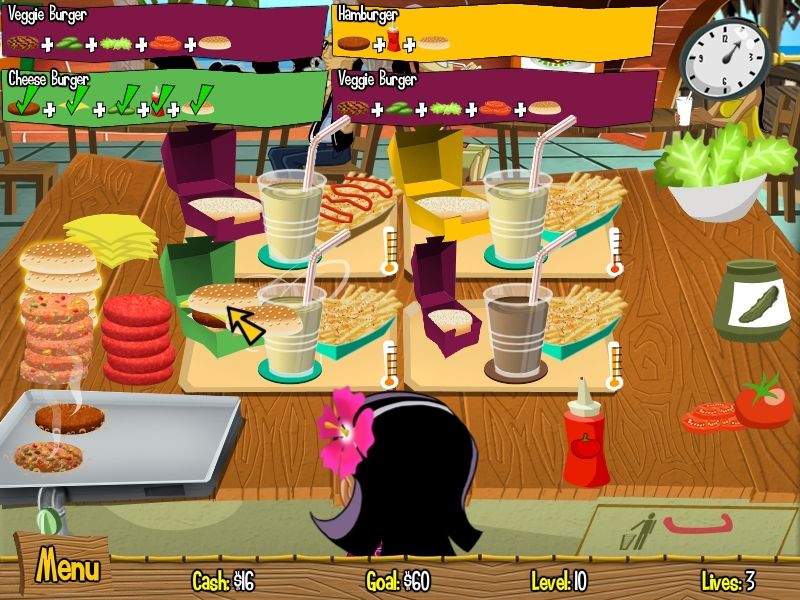 Burger Island places you in the apron of Patty Melton, who must juggle orders, ingredients, and time management to keep Beach Burger afloat. The core mechanic revolves around clicking on individual ingredients—patties, buns, condiments—and assembling each burger, shake, or fries order to exact specifications. Timing is everything: place a patty on the grill and you must watch it sizzle until it’s perfectly done, then layer it in the correct order. A single misstep or delay can see your customer walk away, taking potential profits with them.