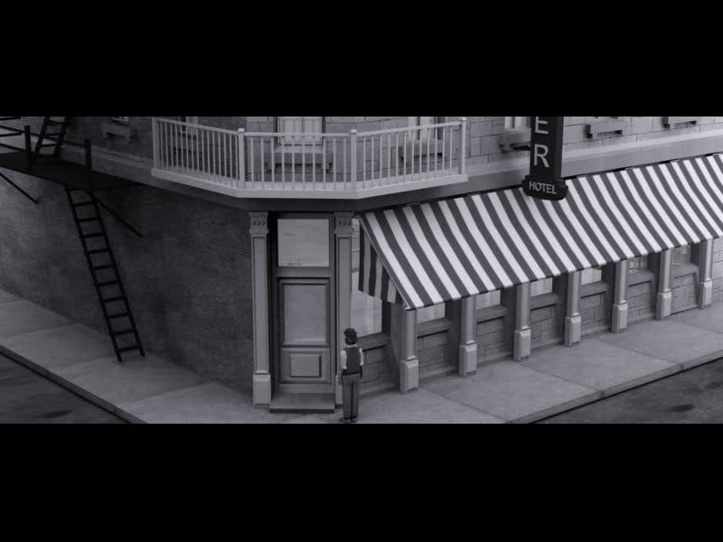 Visually, For a Fistful of Teeth opts for a striking black-and-white palette framed in a letterboxed format. Deliberate film grain and occasional flicker lend the presentation a nostalgic, noir cinema ambiance. This aesthetic choice deepens the 1920s setting, evoking smoky alleyways and dimly lit detective offices, even as it lends an unsettling texture to each scene.