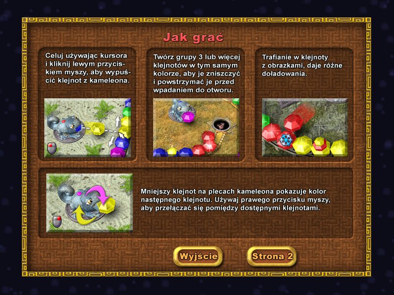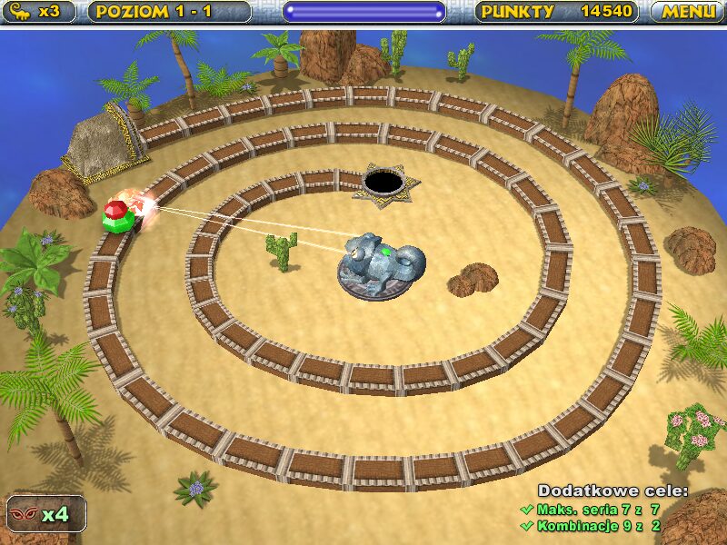 Chameleon Gems delivers an engaging twist on the classic action-puzzle formula, placing you in control of a stone chameleon statue at the heart of a winding Aztec temple corridor. The statue itself cannot move from its central perch, but it can rotate freely, allowing you to target an endless chain of colored gems as they slither along a curved track toward a gaping hole. Your objective is simple: fire matching gems into the chain to create groups of three or more and clear them before they disappear down the chute. This mechanic feels instantly familiar to fans of Marble Madness or Zuma, yet the Aztec motif and unique “statue rotation” control scheme help the game carve out its own identity.