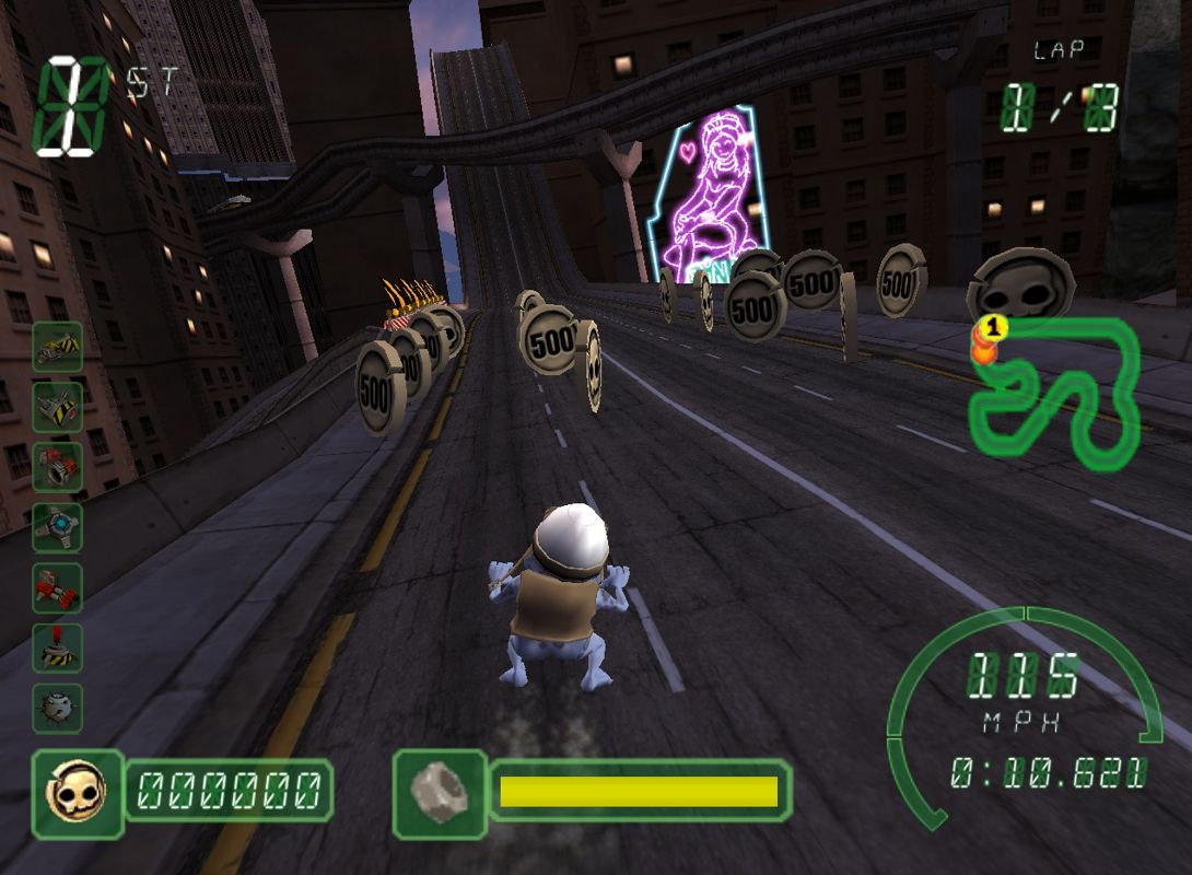 Visually, Crazy Frog Racer leans into a cartoonish aesthetic that complements its lighthearted tone. Character models are exaggerated and colorful—Crazy Frog’s trademark helmet and goggles gleam under bright, candy-colored skies. Tracks range from sun-drenched beaches to neon-lit cityscapes, each adorned with playful environmental details like bouncing springs, moving platforms, and thematic props that enhance immersion.
