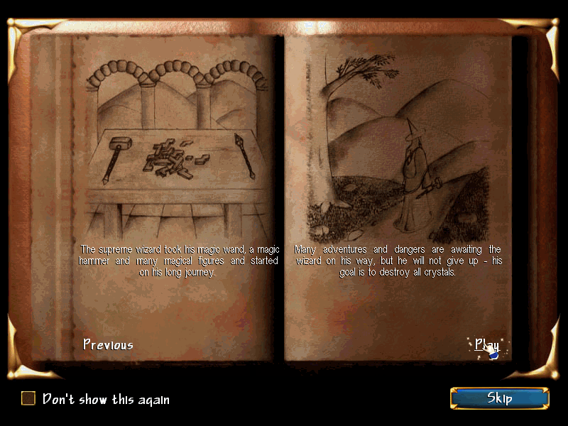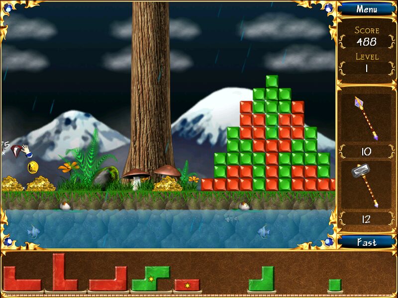 User interface elements are clean and unobtrusive. The bottom panel that displays upcoming figures blends into the scene with ornate frames reminiscent of wizardly tomes. Tool icons for the hammer and wand are distinct and easily accessible, ensuring you never fumble in a tense moment. Overall, the visuals strike a fine balance between decorative fantasy flair and the clarity needed for fast-paced puzzle action.