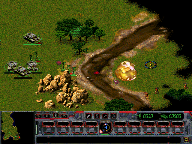 Lighting effects are modest but effective: muzzle flashes, explosions, and cloaking visuals lend combat a cinematic flair. While the engine doesn’t support dynamic shadows or modern shaders, the layering of terrain decals (blood spatters, scorch marks, wreckage) adds a palpable sense of ongoing conflict. Cutscenes between missions employ digitized full-motion video and rendered flybys, which capture the game’s atmosphere even if the acting and voice work are somewhat dated.