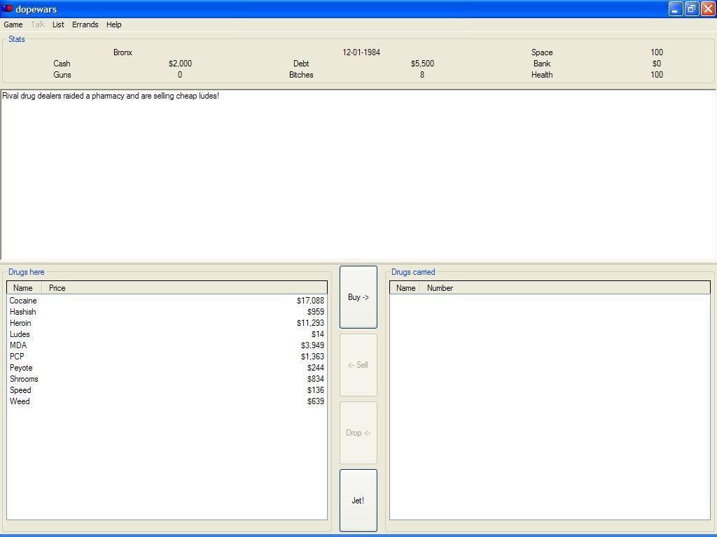 Dope Wars 2.0 also offers optional power-ups and hints of narrative flavor—loan sharks demanding payment, street contacts offering special deals, and occasional rumors of police stings. These elements add depth without overwhelming the core mechanics. Overall, the gameplay is a blend of resource management, risk assessment, and strategy, all wrapped up in a fast-paced, tension-fueled arcade style.