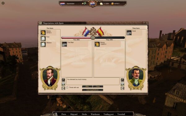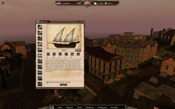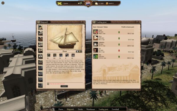 The deeper management action happens at your port, where you can construct historically accurate ships such as schooners, brigs, flutes, East Indiamen, galleons and later, ships-of-the-line bristling with cannons. Here you hire crews and commanders, upgrade shipyards, warehouse goods, and analyze dynamic markets for commodities like silk, porcelain, iron, wool and tobacco. Prices fluctuate over time based on supply and the actions of rival companies, so anticipating demand and undercutting competitors is key to turning profits and fulfilling campaign objectives.