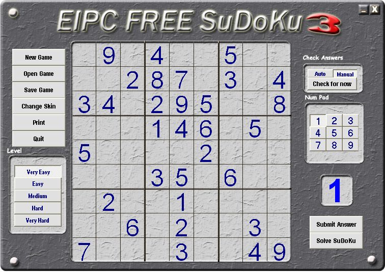 Blending timeless Sudoku mechanics with thoughtful features, EIPC Free SuDoKu 3 strikes a balance between simplicity and depth. Beginners will appreciate the clear rules and adjustable difficulty, while veterans will relish the master-level grids and manual-checking challenge. The ability to save progress and switch skins on the fly adds modern conveniences without overcomplicating the interface.