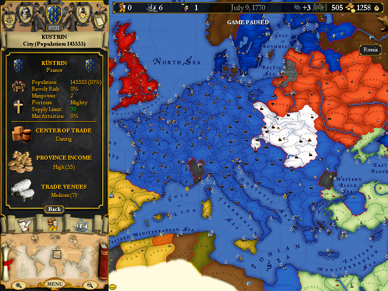 Visually, Europa Universalis opts for a functional, map-focused presentation rather than flashy 3D battles. The world map is richly detailed, with provinces color-coded by ownership and terrain features clearly distinguished. Icons for armies, navies, trade routes and religious centers are intuitive, letting you see the state of your realm at a glance. Though the graphics engine may feel dated by modern standards, the clarity of information on the screen is what truly matters in a complex strategy title.