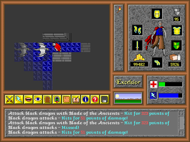 The color palette strikes a balance between earthy realism and high-fantasy vibrancy. Towns glow with warm lantern light, while dungeons lean into cooler tones that underscore their ominous depths. Dynamic lighting effects—such as spell glow or torch flicker—add atmosphere without overwhelming the classic tile grid. Even on higher resolutions, tiles snap crisply, preserving that retro feel.
