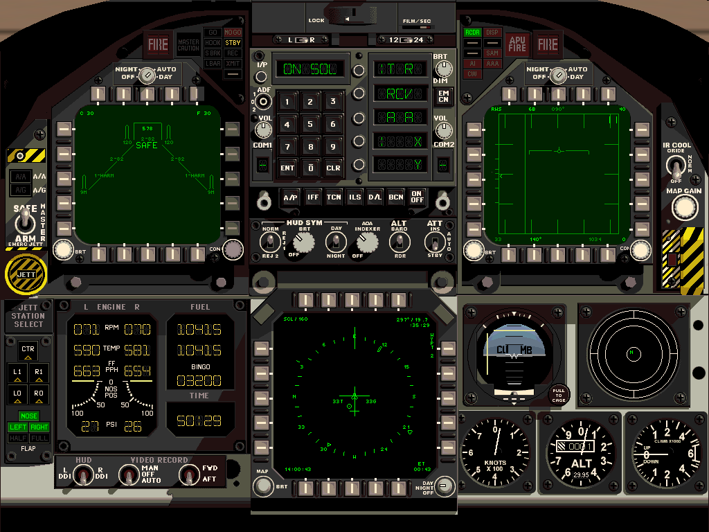 For its era, F/A-18 Precision Strike Fighter delivers crisp cockpit instrumentation and convincingly modeled external visuals. Each switch, gauge, and HUD element is rendered with clarity, ensuring that pilots can identify fuel levels, weapon loads, and radar contacts at a glance. The cockpit’s 3D environment offers a strong sense of presence, especially during low-altitude strafing runs when ground features whiz by the canopy.