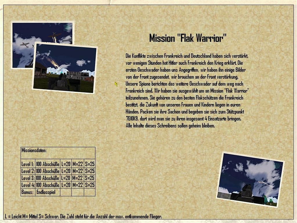 Each of the five missions is framed by a short text briefing that hints at the larger conflict and places your flak cannon in varying tactical scenarios—ranging from coastal defense to mountain passes. Though these blurbs are sparse, they provide just enough context to elevate the sense of purpose behind each skirmish.