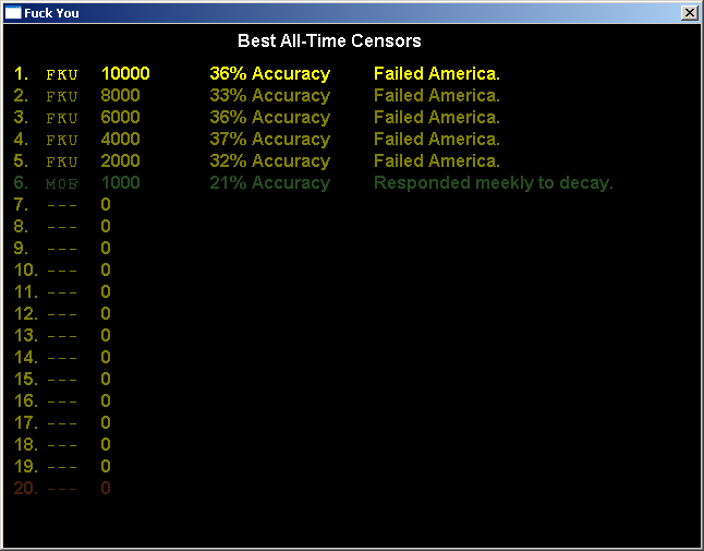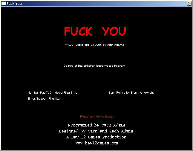Whether you’re an arcade veteran chasing high scores or a casual gamer curious about a clever spin on classic mechanics, “Fuck You” offers a compact yet memorable experience. Its blend of humor, challenge, and stylistic charm ensures you’ll keep coming back to shield your pixel babies from the hazards of unstarred profanity—one vowel at a time.