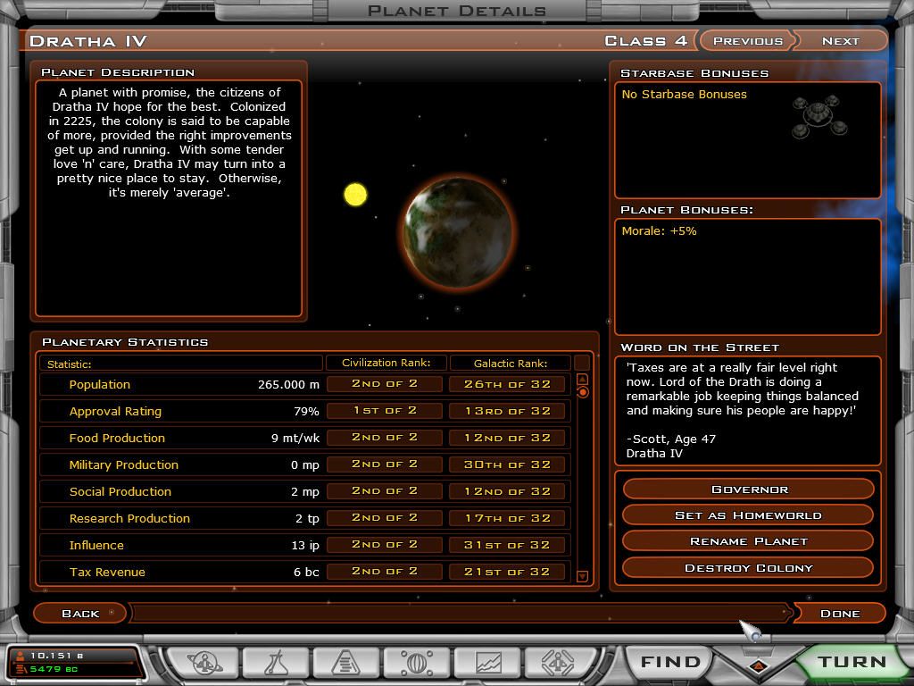 Although released in 2006, Galactic Civilizations II exhibits a clean and approachable visual style that has aged gracefully. Starfields shimmer with depth while planetary surfaces display distinct biomes, from lush jungles to barren deserts. The user interface is intuitive, with clear icons, informative tooltips, and well-organized menus that let you manage colonies, research, and diplomacy without constant menu-hopping.