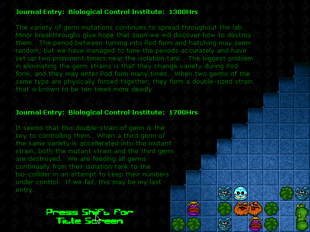 The story unfolds through bite-sized text logs and animated cutscenes that illustrate your successes—and occasional setbacks—in the lab. These narrative beats are concise but effective, lending weight to each germ elimination and reminding you that there’s more at stake than mere puzzle scores. As you progress, you uncover hints of a deeper plot: a shadowy organization experimenting with germ weaponization, raising the tension between scientific discovery and moral responsibility.