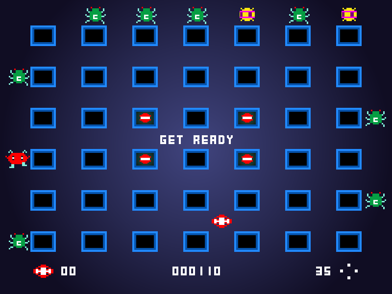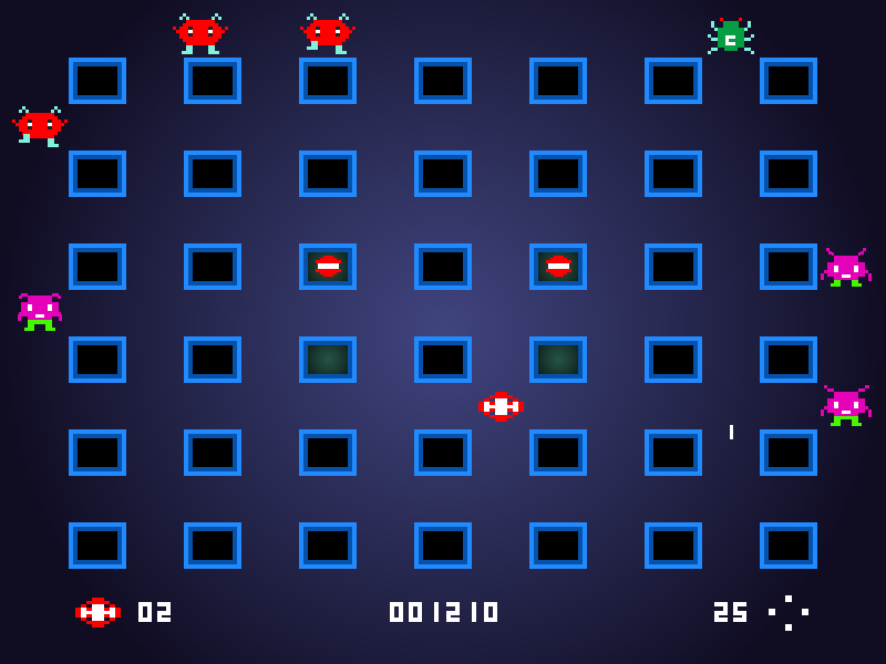 The creature design evolves over time, cycling through four distinct shapes and colors—yellow, green, red, and pink—each hit taking you one step closer to clearing them from the grid. Limited ammunition adds another layer of tension: with only 35 bullets per life and a warning icon popping up at ten remaining shots, every round fired matters. Bonus orbs occasionally materialize in the grid’s center once you’ve expended a certain number of bullets, rewarding precise play and offering a chance to refill your reserves.